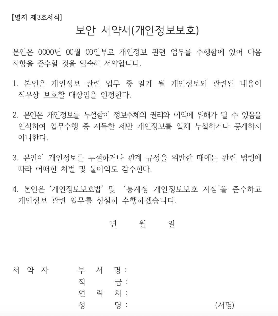 개인정보를 담당하는 사람들에게 보안서약서를 받을 때 사용할 수 있습니다.