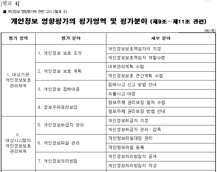 [별표 4] 개인정보 영향평가의 평가영역 및 평가분야 (제9조~제11조 관련)((개인정보보호위원회) 개인정보 영향평가에 관한 고시).hwp