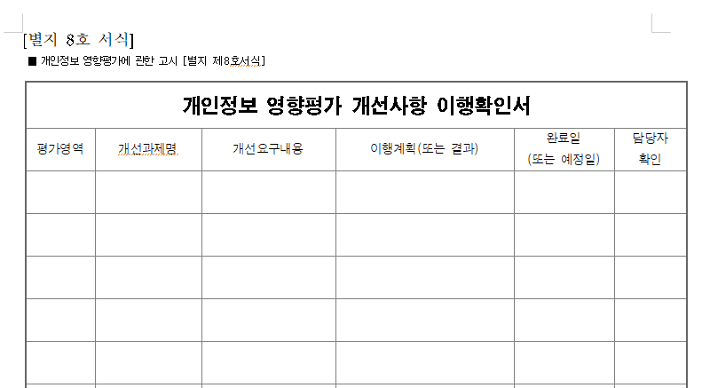 개인정보 영향평가 개선사항 이행확인서는 아래에서 다운로드 할 수 있습니다.