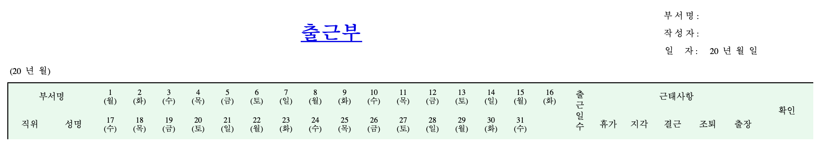 출근부 엑셀파일 다운로드