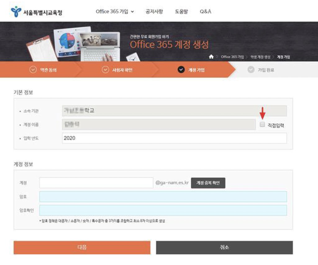 아래와 같은 순서로 계정을 만들어서 사용하면 됩니다. 계정의 최종 형태는 ID@학교명.sen.ms.kr과 같은 형태로 만들어집니다. 이렇게 계정을 만드는 방법은 아래와 같습니다.