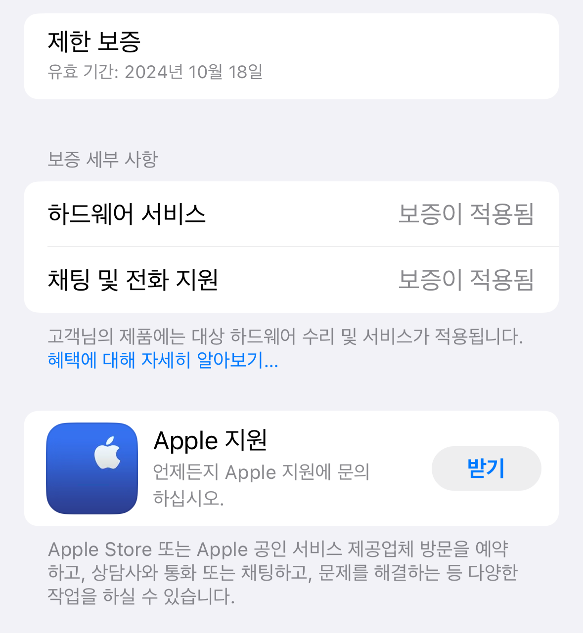 위와 같이 2023년 10월에 구매한 아이폰도 제한 보증기간이 2024년 10월로 표기가 됩니다.
