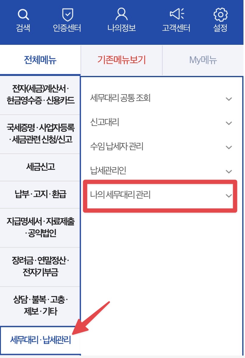 - 전체메뉴 > 세무대리/납세관리 > 나의 세무대리 관리 > 나의 세무대리인 조회
