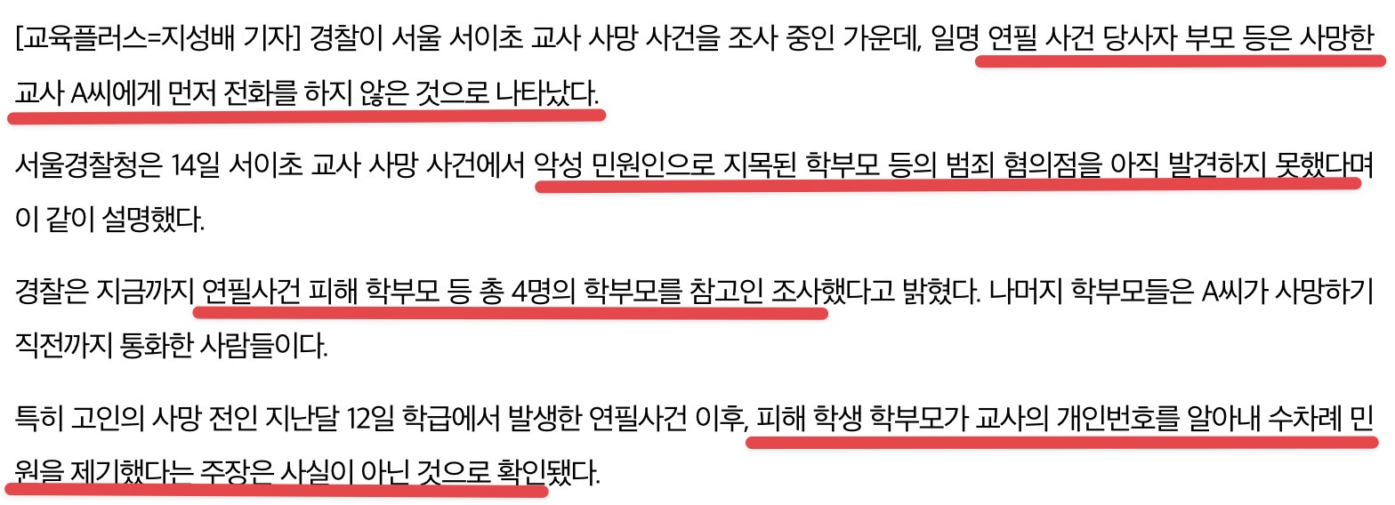 서이초 안타까운 사고에 대해서는 대부분이 아실 것이라고 생각합니다. 아래의 기사를 보면 서이초에서 발생한 사고는 복합적인 사건이 한 교사에게 발생하면서 생긴 사고입니다. 한 학생이 한 학생의 이마에 연필을 긋는 사고 이후 가해 학생, 피해 학생의 학부모가 담당 교사에게 민원을 제기하면서 이루어진 일입니다.