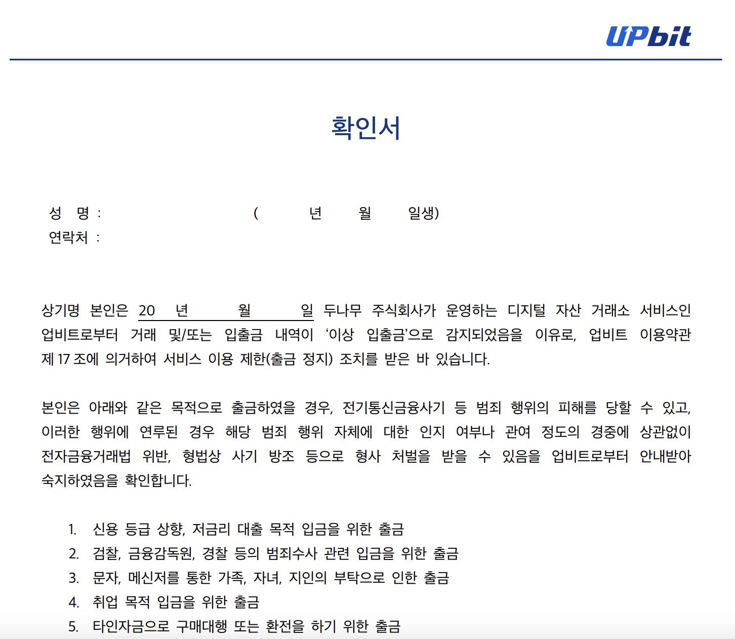 업비트 확인서 서약서 다운로드 링크는 아래와 같습니다.