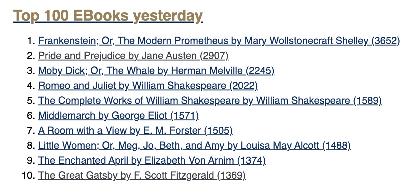 구텐베르크 프로젝트에서 가장 많이 다운로드 되는 책들