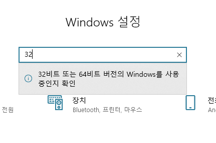 설정을 클릭하면 설정화면이 나오는데 여기 창에 "32"라고 치면 아래와 같이 '32비트 또는 64비트 버전의 Windows를 사용 중인지 확인'이라는 자동 완성 창이 나옵니다.