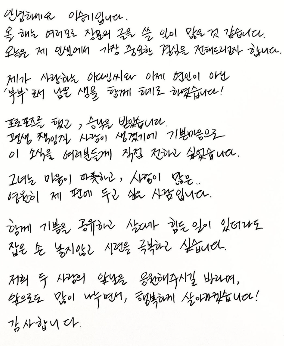 이승기 결혼발표 손편지, 이다인 인스타그램 알아보기