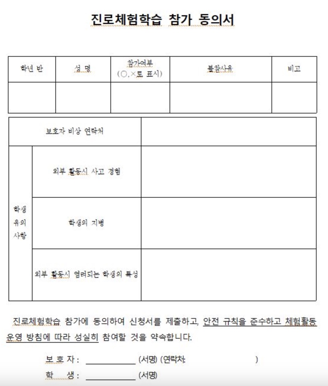 진로 체험학습 신청서는 학생들이 특정 직업이나 분야에 대한 실제 경험을 할 수 있도록 학교나 관련 기관에 제출하는 문서입니다. 이 신청서는 학생의 학습 목적, 체험하고자 하는 분야, 체험 일정 등을 명확히 기술해야 합니다. 아래에 진로 체험학습 신청서 작성 방법과 기본 양식을 안내해드리겠습니다.