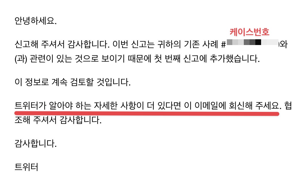 메일을 보낸다음에 추가할 사항이 생기면 또 보내면 아래와 같이 같은 케이스에 추가하여 검토한다는 메일이 오게된다.