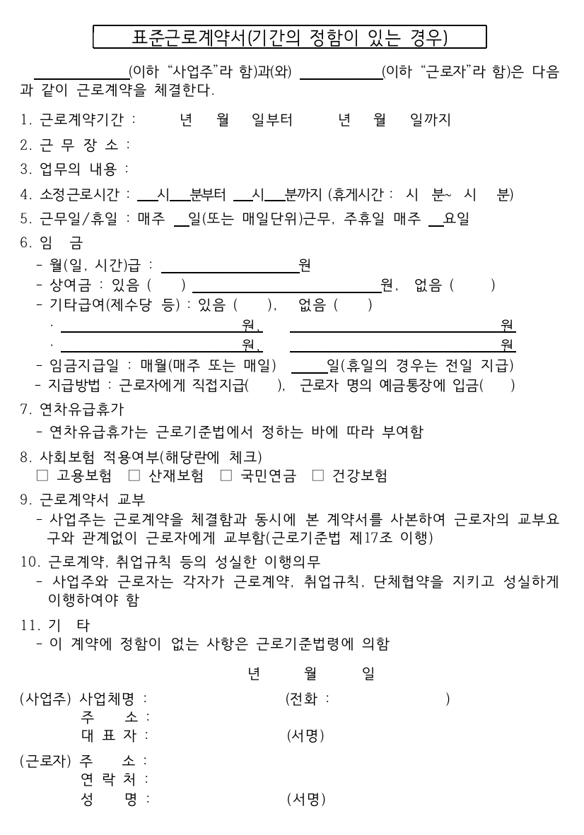 계약직을위한 표준근로계약서입니다. 계약직은 기간의 정함이 있는 경우에 사용합니다.