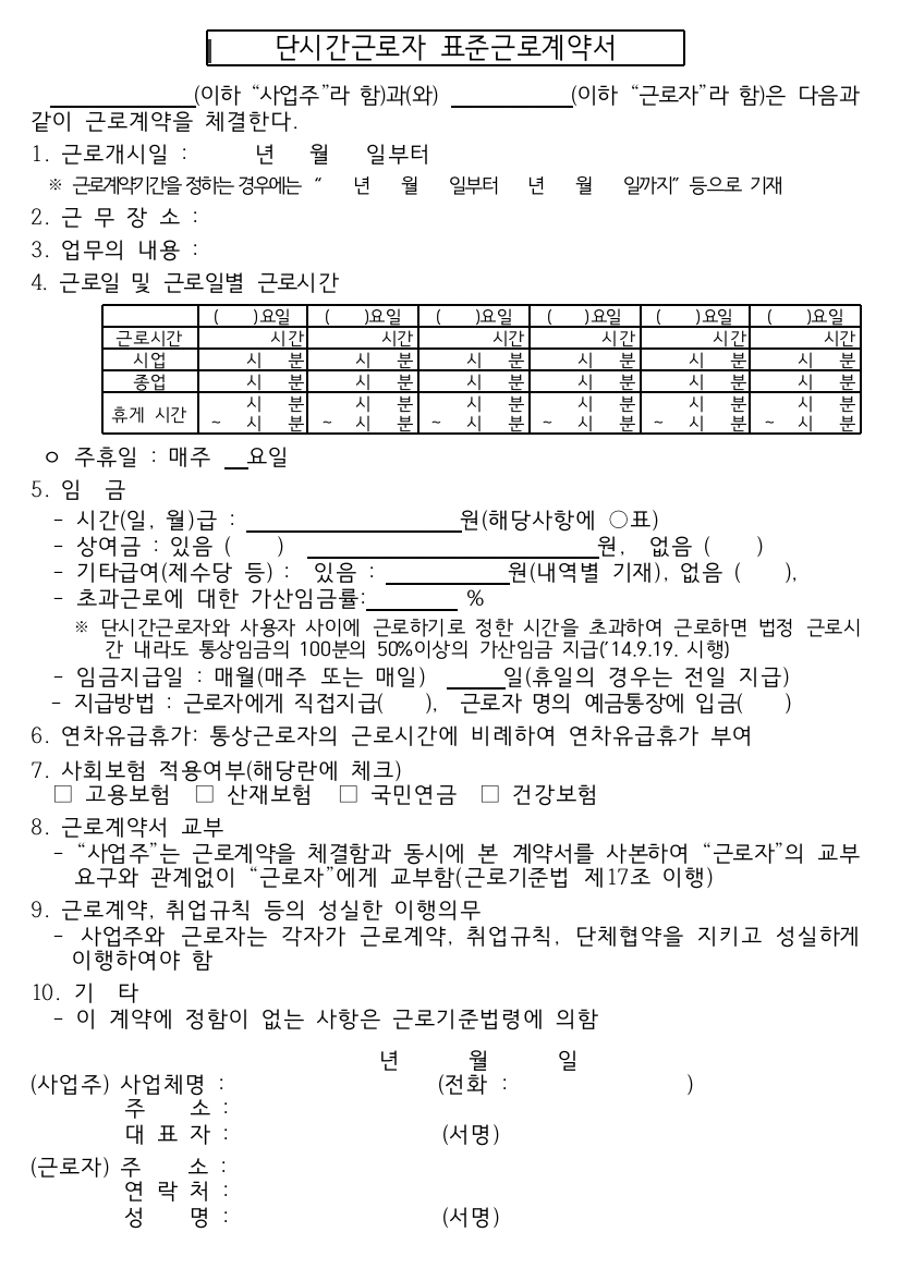 단시간근로자 즉, 아르바이트생을 위한 표준근로계약서입니다.