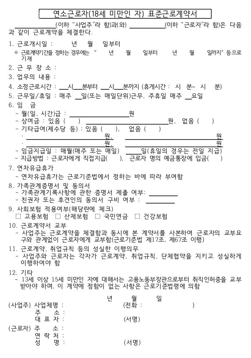 단기 아르바이트용 표준근로계약서와 계약직 표준근로계약서 뿐만아니라 미성년자 고용시에 사용하는 서식을 공유합니다.