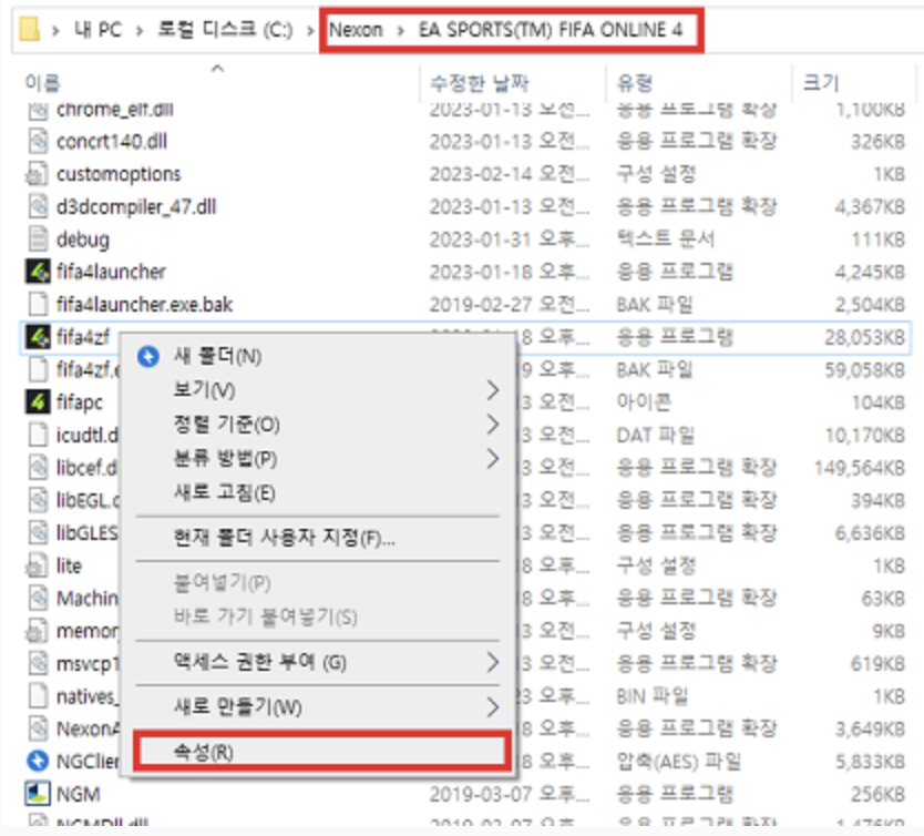 - 위의 fifa4zf 파일을 찾게 되면 마우스로 우클릭