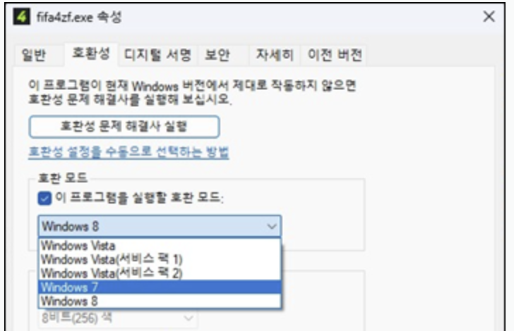 - [호환 모드] 항목에서 '이 프로그램을 실행할 호환 모드:' 박스를 체크하고 [Window 7]으로 변경