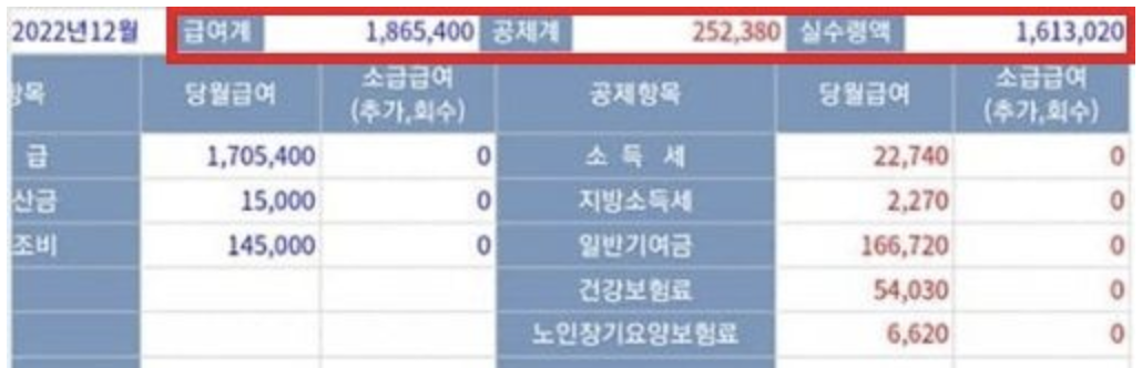 아래는 2022년 12월 봉급표입니다. 161만원 정도 급여를 받았네요.