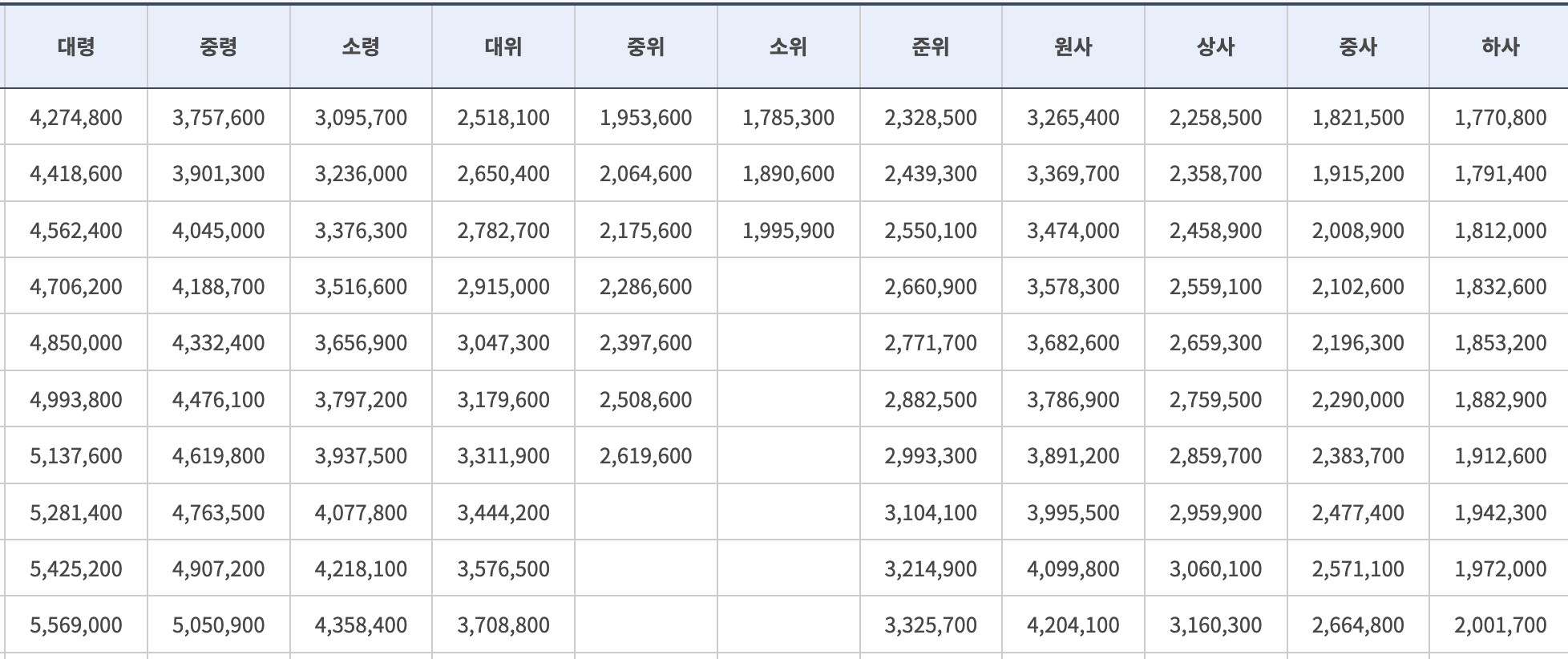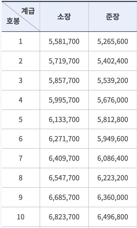 원스타 소장의 경우도 10호봉이 되어도 700만원도 되지 않는 것을 알 수 있습니다.