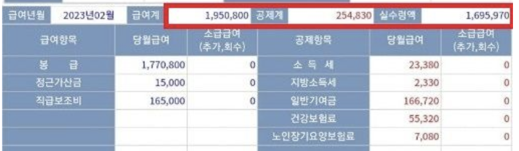 그런데 올 2023년 2월 봉급표는 169만원이 되었습니다.