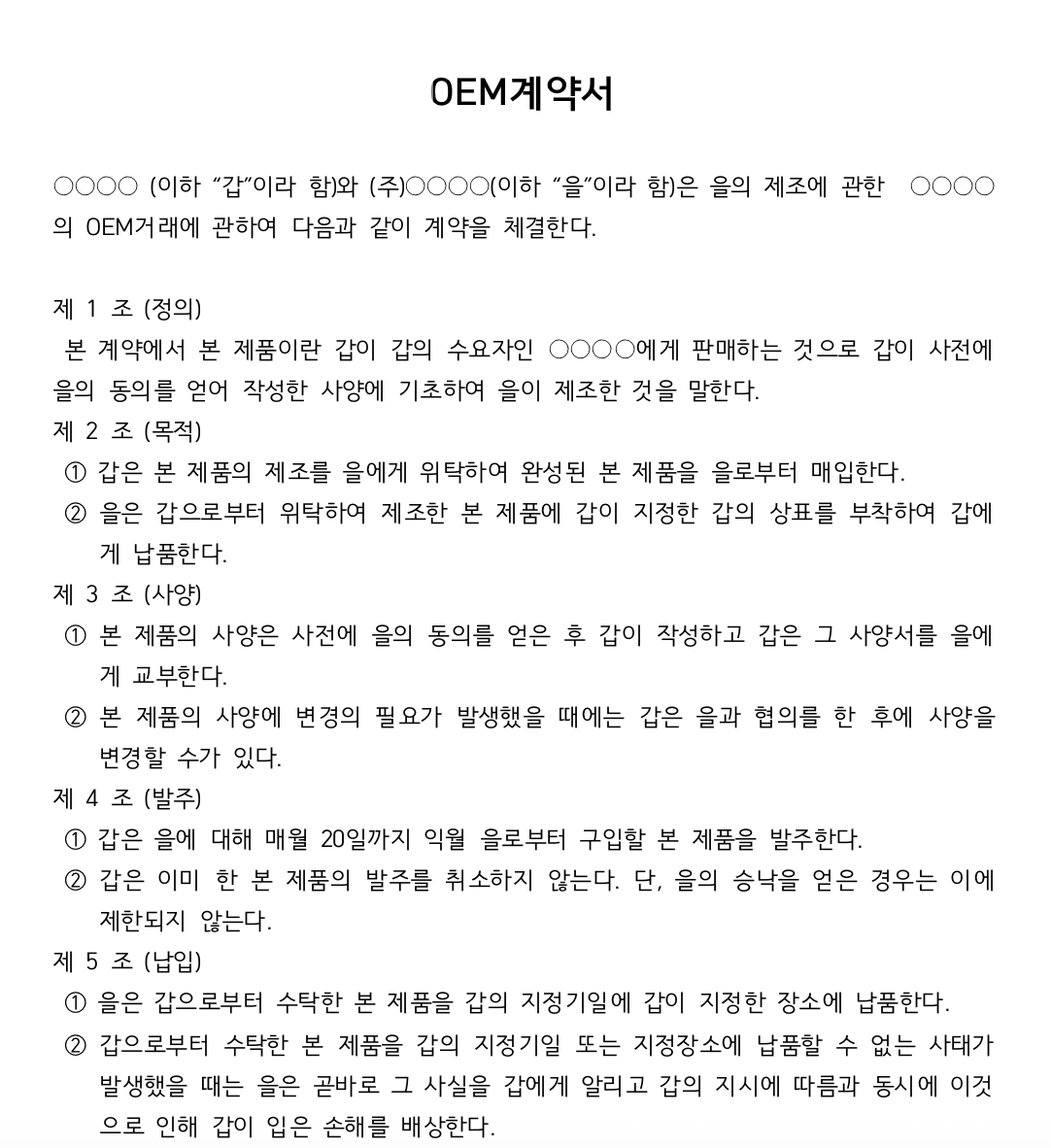 OEM 계약서 양식입니다. 양식을 참고하여 실제 계약할 때 필요한 내용은 수정 보완하고, 법무 검토를 받은 후 계약을 체결하는 것이 좋습니다.